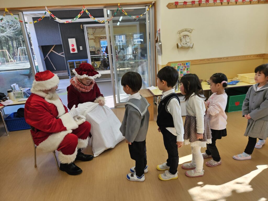 サンタさんから一人ずつプレゼントをもらうと、こどもたちは嬉しそうに微笑んでいました☺☺☺