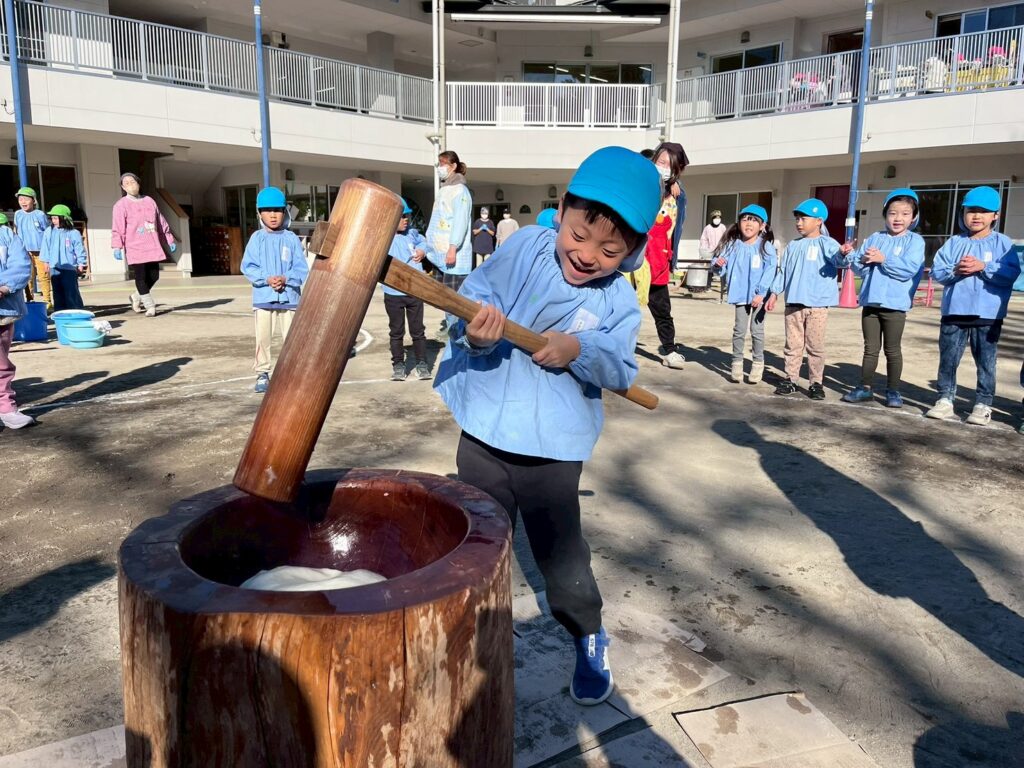 大きいクラスの保護者の方の協力のもと、こどもたちはもちつきを体験したり、つきたてのお餅をたべたり、普段できない体験を楽しむことができました☺