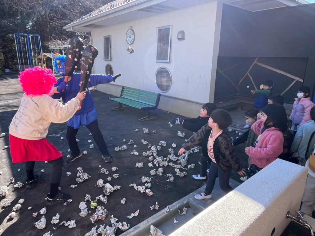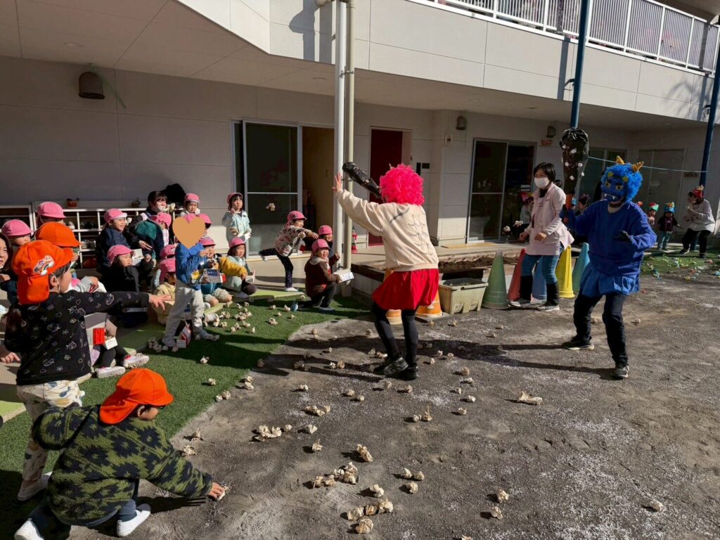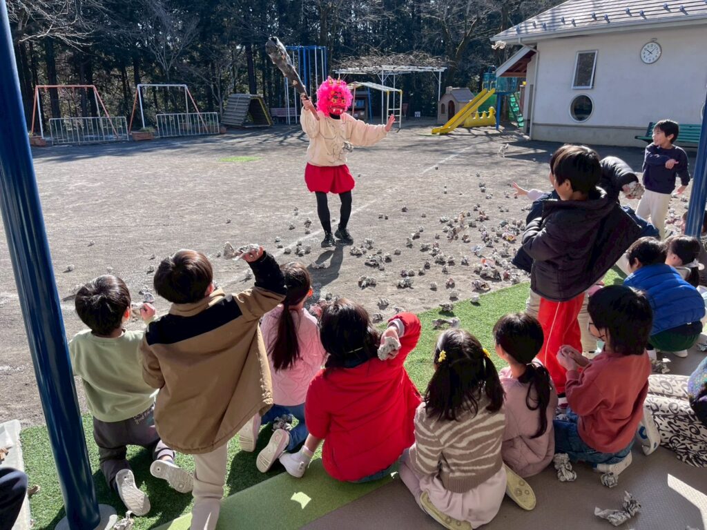 園庭に鬼が入ってくると、「鬼は外、福は内!」という掛け声とともに自分たちで作った豆を鬼に向かって投げました!今年の鬼は少し手ごわそうです👹こどもたちは頑張って豆をたくさん投げました!!
